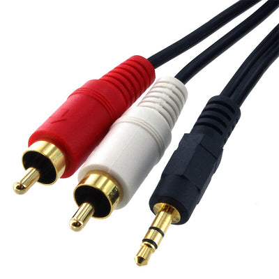 To two RCA (right/left) stereo patch cable is primarily used to connect iPod, computer and laptop outputs to large stereo systems. Simply plug the 3.5mm plug into the headphone jack of your device or computer and the 2 RCA's to the left and right auxiliary inputs on your sound system.