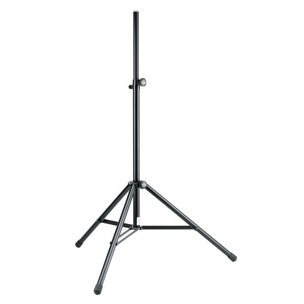 Worldwide accepted: the speaker stand 214/6 ‒ robust and sturdy. All clamps are high quality zinc die-cast. The leg construction and large fixed foot end caps enhance safety and stability. Other features are the pull-out guard for the extension tube, the integral anti-shock component and comfortable height adjustment with spring-loaded bolt and locking screw. Comes with a mounting aid on the extension rod.